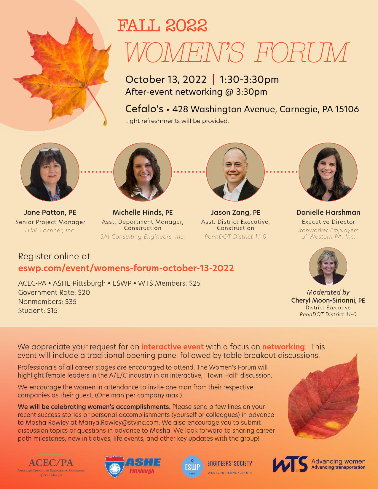 Professionals of all career stages are encouraged to attend. The Women’s Forum will highlight female leaders in the A/E/C industry in an interactive, “Town Hall” discussion.